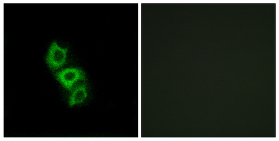 Immunofluorescence analysis of A549 cells, using APOL5 antibody. The picture on the right is treated with the synthesized peptide.