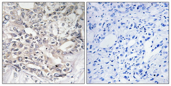 Immunohistochemistry analysis of paraffin-embedded human liver carcinoma tissue using APOL5 antibody. The picture on the right is treated with the synthesized peptide.