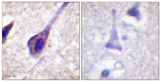 Immunohistochemistry analysis of paraffin-embedded human brain tissue using BID (Ab-78) antibody. The picture on the right is treated with the synthesized peptide.