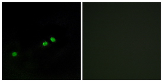 Immunofluorescence analysis of HeLa cells, using Centromeric Protein A (Phospho-Ser7) antibody. The picture on the right is treated with the synthesized peptide.