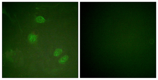 Immunofluorescence analysis of HeLa cells, using ETS Domain Protein Elk-3 antibody. The picture on the right is treated with the synthesized peptide.