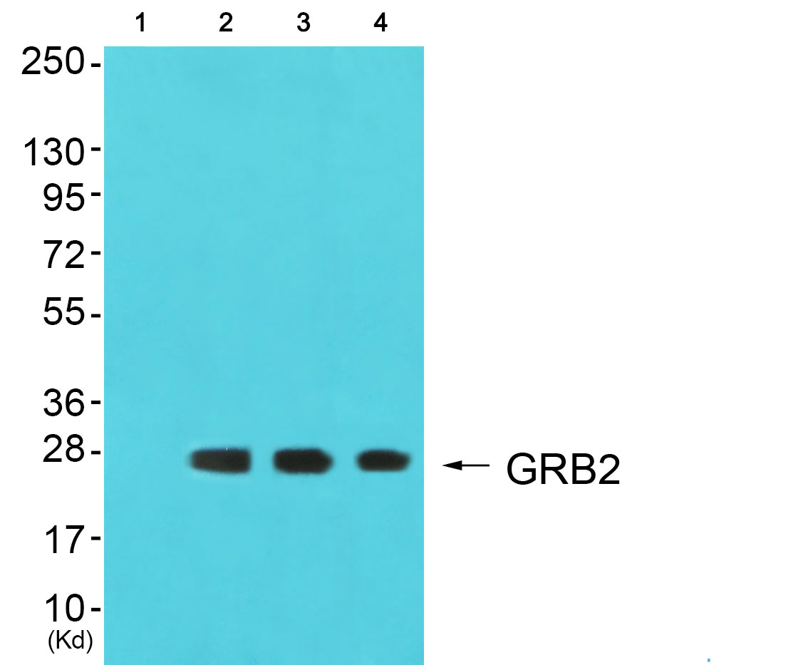 Western blot analysis of extracts from JK cells (Lane 2), cos-7 cells (Lane 3) and 293 cells (Lane 4), using GRB2 Antibody. The lane on the left is treated with synthesized peptide.