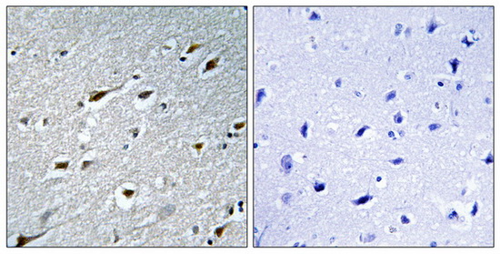 Immunohistochemistry analysis of paraffin-embedded human brain tissue using HAND1 antibody. The picture on the right is treated with the synthesized peptide.
