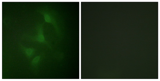 Immunofluorescence analysis of HeLa cells, using JNK1/2/3 (Ab-183/185) antibody. The picture on the right is treated with the synthesized peptide.