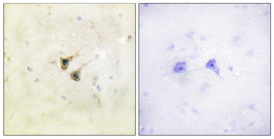 Immunohistochemistry analysis of paraffin-embedded human brain tissue using PBK/TOPK (Ab-9) antibody. The picture on the right is treated with the synthesized peptide.