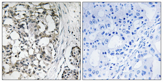 Immunohistochemistry analysis of paraffin-embedded human breast carcinoma tissue using PEX14 antibody. The picture on the right is treated with the synthesized peptide.