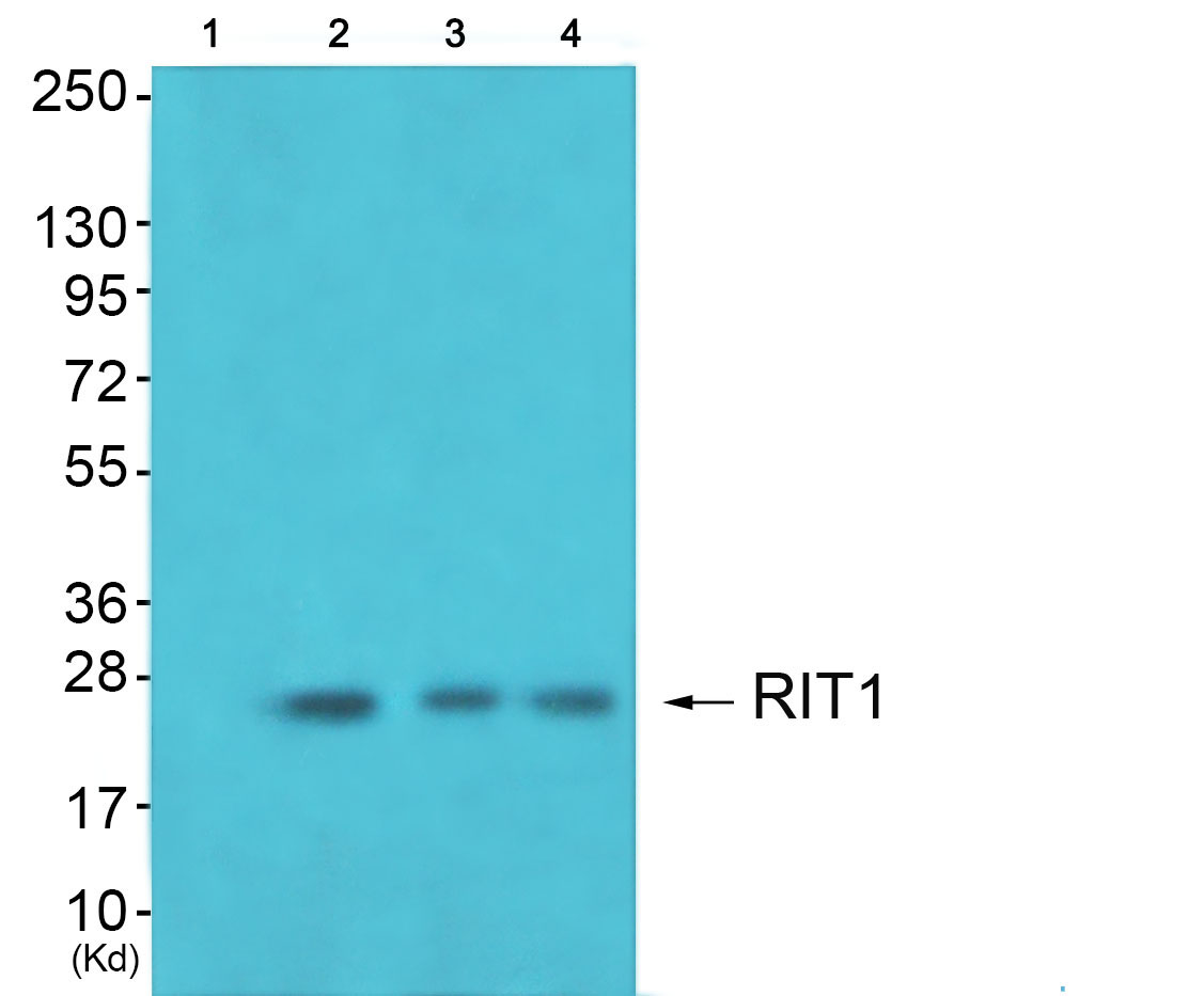 Western blot analysis of extracts from K562 cells (Lane 2), JK cells (Lane 3) and 293 cells (Lane 4), using RIT1 Antibody. The lane on the left is treated with synthesized peptide.