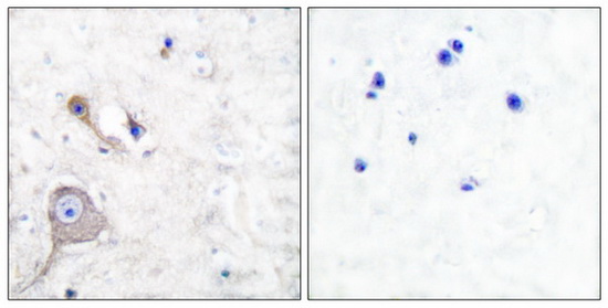 Immunohistochemical analysis of paraffin-embedded human brain tissue using S100 A1 antibody (#C0318). The picture on the right is treated with the synthesized peptide.
