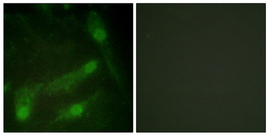 Immunofluorescence analysis of HeLa cells, using Smad2 (Phospho-Thr220) antibody. The picture on the right is treated with the synthesized peptide.