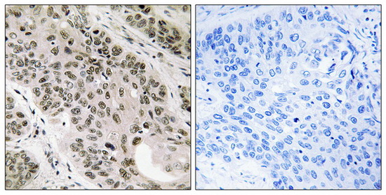 Immunohistochemistry analysis of paraffin-embedded human lung carcinoma tissue using TNNI3K antibody. The picture on the right is treated with the synthesized peptide.